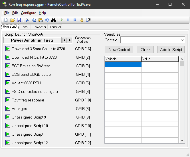 RemoteControl is a separate executable used by the TESTWAVE_REMCTRL VSS block to execute GPIB scripts as part of a VSS simulation. RemoteControl can also be run as a standalone program, and it allows you to create a GPIB instruction sequence (or "script") to configure test equipment to make measurements. It can be used to automate often-used instrument set-ups (like an internal instrument state store), or it can be used to program measurement sweeps and data collection. Its flexibility and power is comparable with a simple programming language. Full documentation for RemoteControl is provided in remctrl.chm.