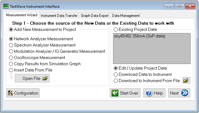 This part of TestWave is used primarily to import measurements from test equipment into the simulator. Small-signal s-parameters can be captured from network analyzers. Spectrum analyzer and oscilloscope waveform measurements can also be imported. Modulation measurements in IQ format can be acquired from vector signal analyzers, and bi-directional transfer is possible with vector signal generators equipped with an arbitrary waveform buffer (ARB).